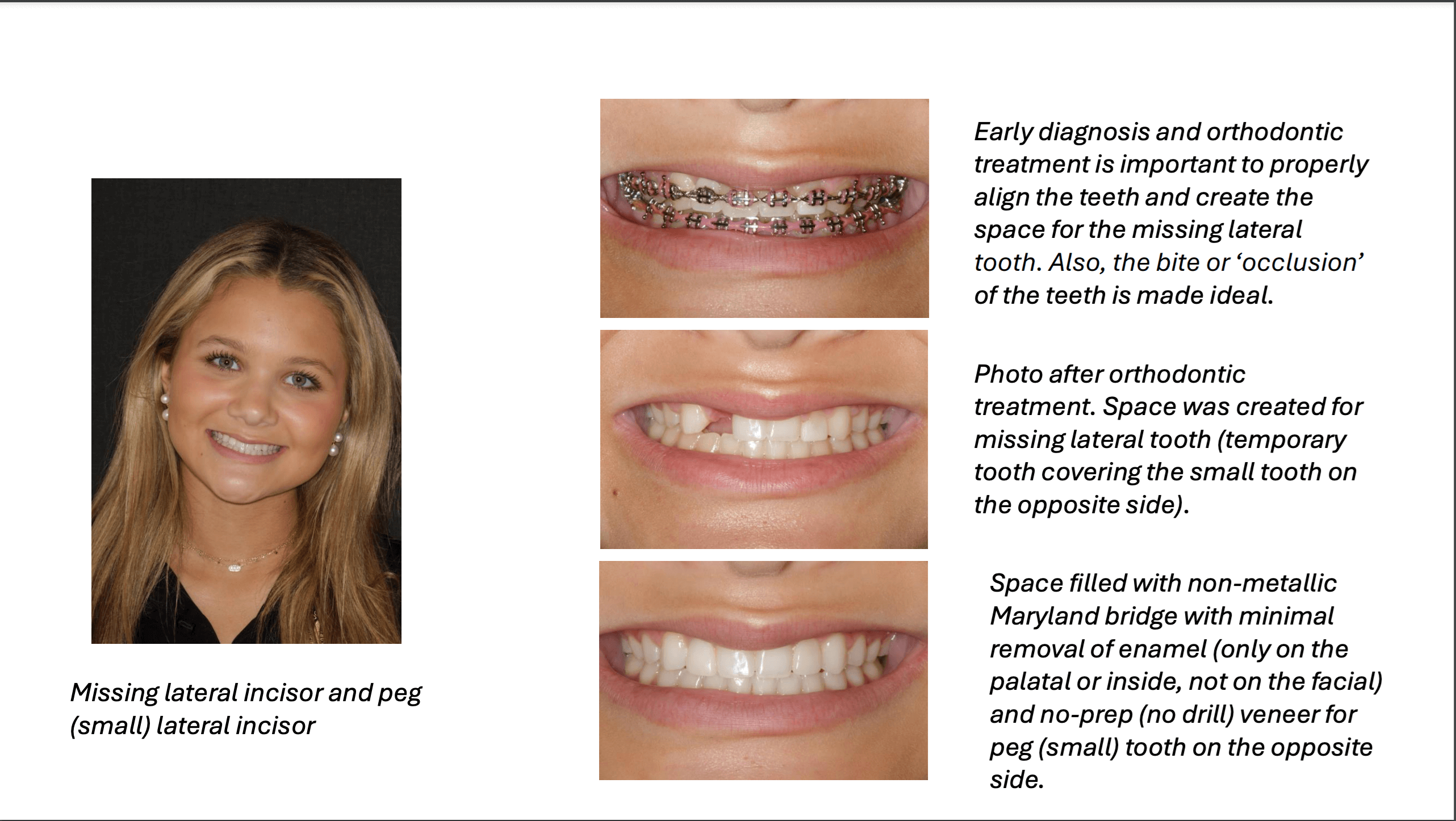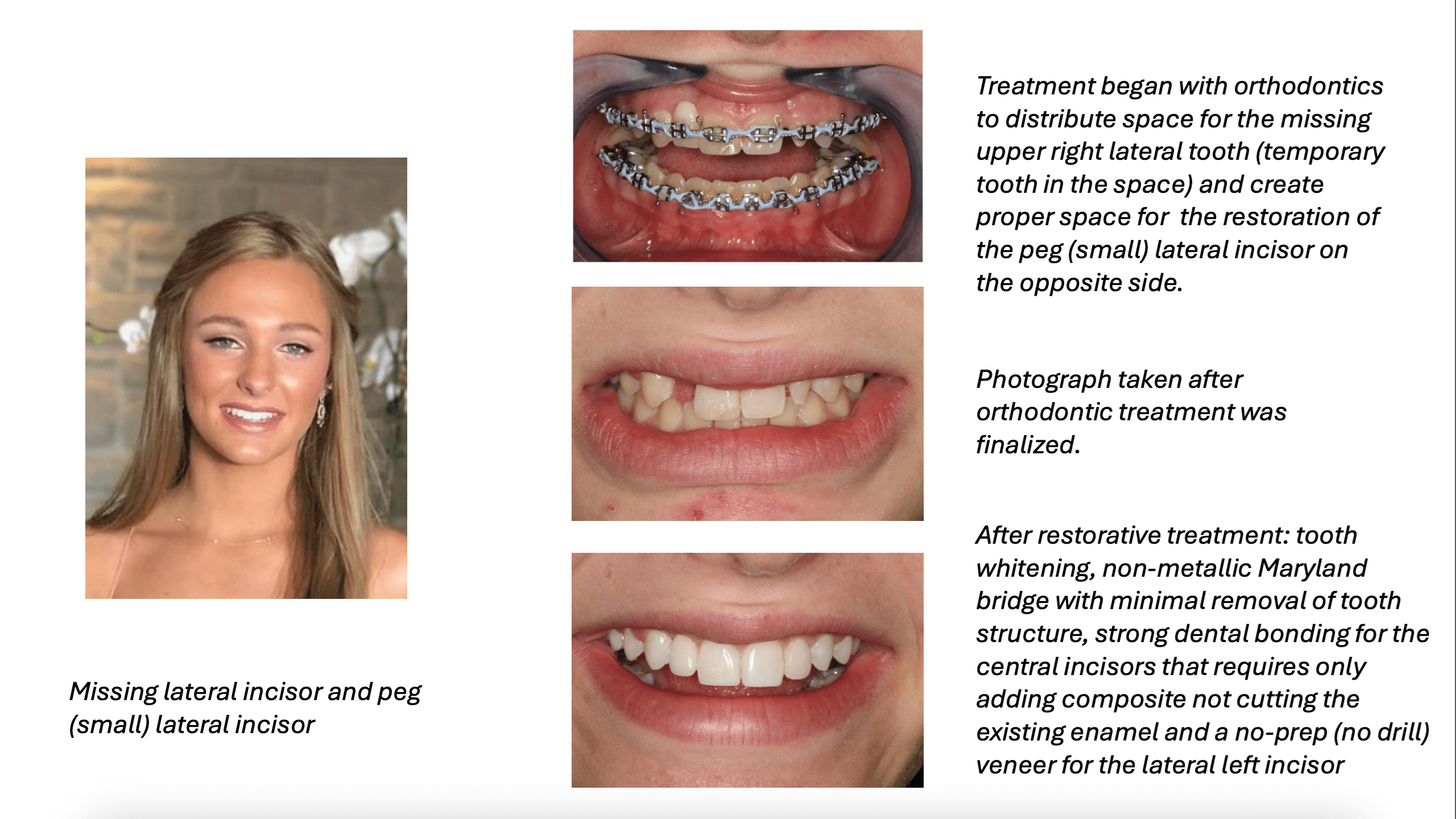 Cosmetic Dentistry for Adolescents addresses both aesthetic concerns and functional challenges that younger patients face due to congenitally missing or misshapened teeth. This stage of dental development can be particularly difficult because patients often need to wait for the full development of their facial bone structure before permanent solutions can be applied. The typical congenitally missing teeth are lateral incisors that are in the front part of the mouth which can compromise the smile in a young patient. These cases in adolescent patients need a multi-disciplinary approach to obtain the best aesthetic and functional results. Dr. Patricia Roach and her team work closely with orthodontists to provide an effective dental solution during this transitional phase. These treatments not only enhance the appearance of young patients' smiles but also help ensure proper dental function as they continue to grow.
